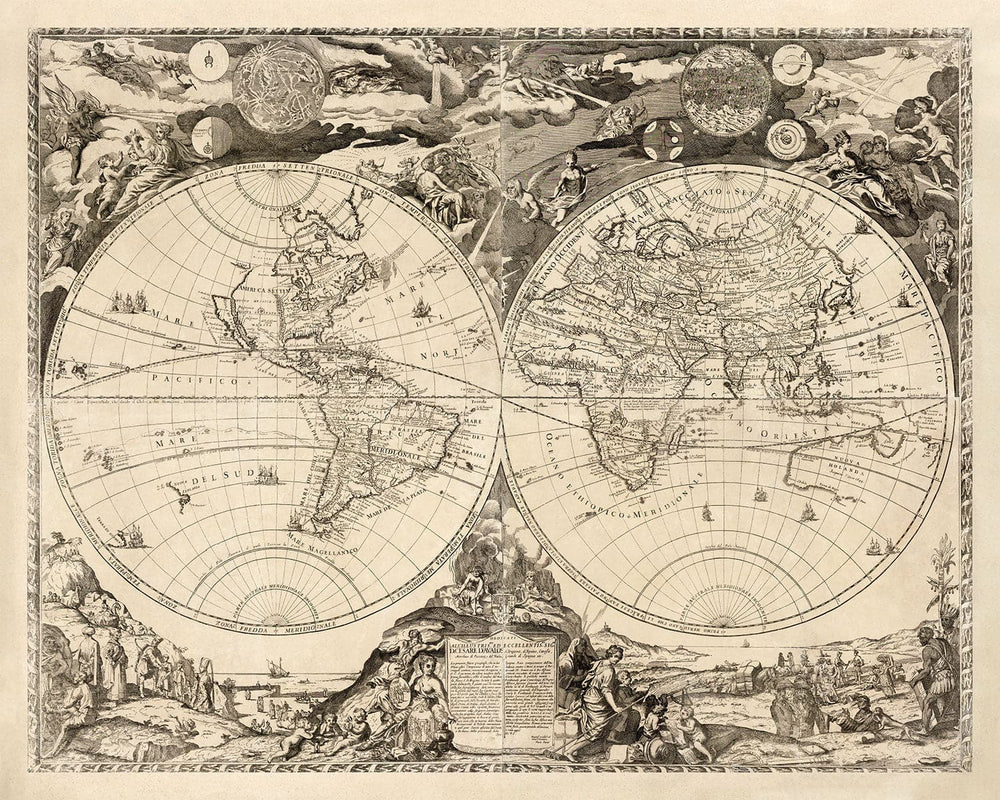Se sabe muy poco sobre Paolo Petrini, aparte de que publicó un atlas muy raro y hermoso llamado Atlante Partenopeo entre 1700 y 1718, del cual proviene este mapa del mundo. Puede que solo haya 1 copia de este mapa en existencia, así que estás comprando una impresión bastante especial aquí.