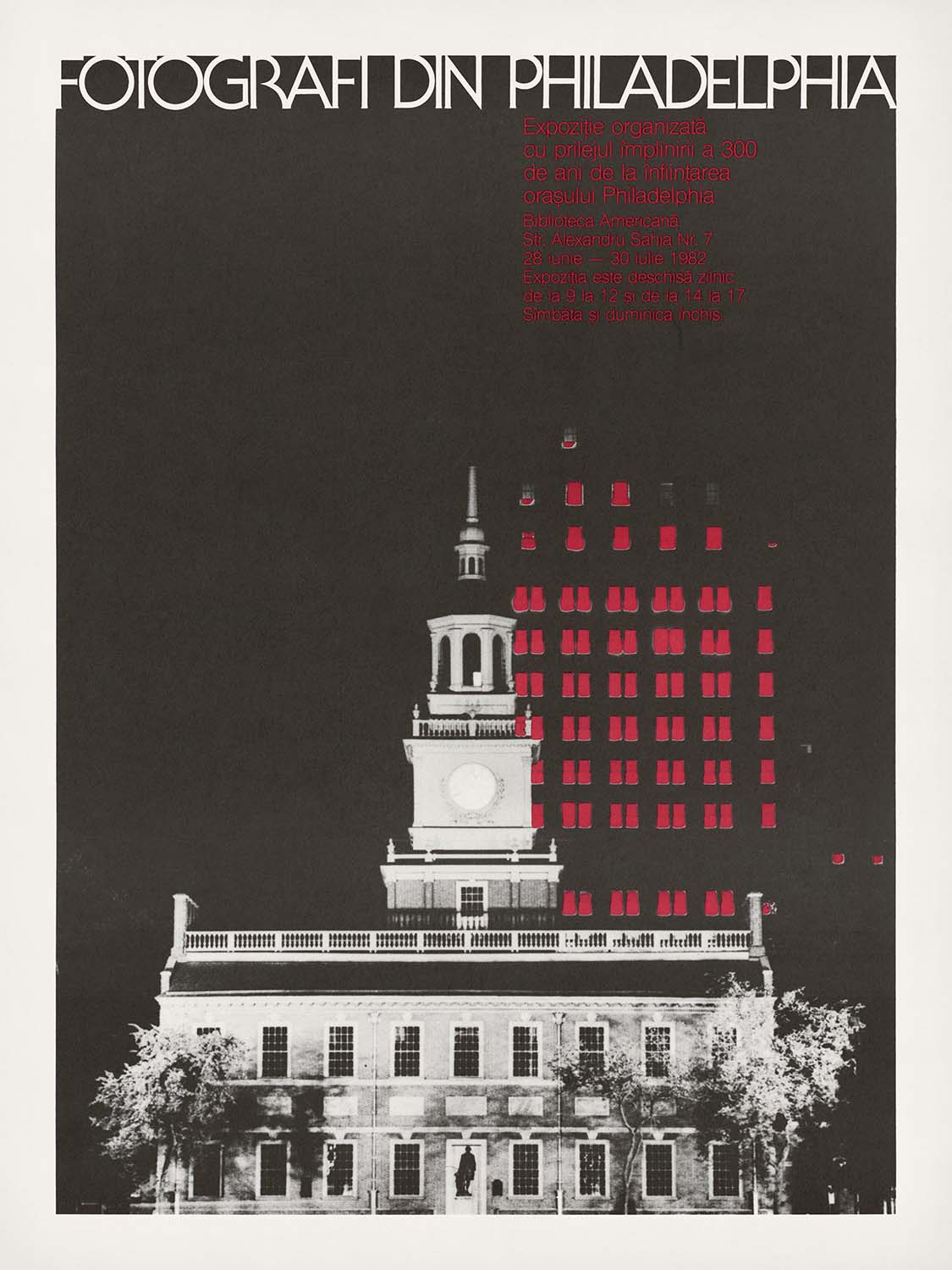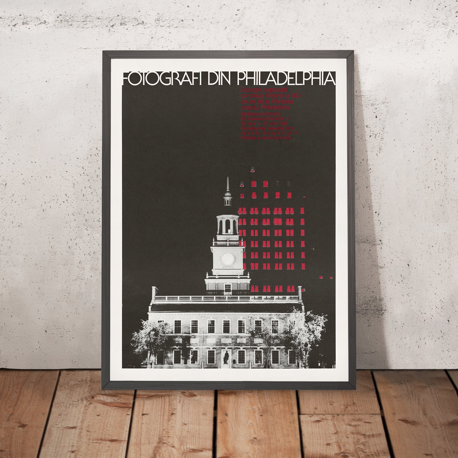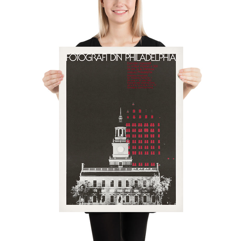 Fotografi Din Philadelphia by the U.S. Information Agency is a striking vintage travel-and-culture poster conceived for an international exhibition celebrating Philadelphia’s 300th anniversary. With Independence Hall at its heart, the composition marries historic architecture to a sleek, post‑war graphic sensibility—halftone textures, a confident minimalist palette, and typographic clarity—capturing the city as both birthplace of American democracy and a living, modern destination. The Scandinavian- or Eastern European‑sounding title signals the work’s intended global audience: an invitation for travelers abroad to discover Philadelphia through photography and design.