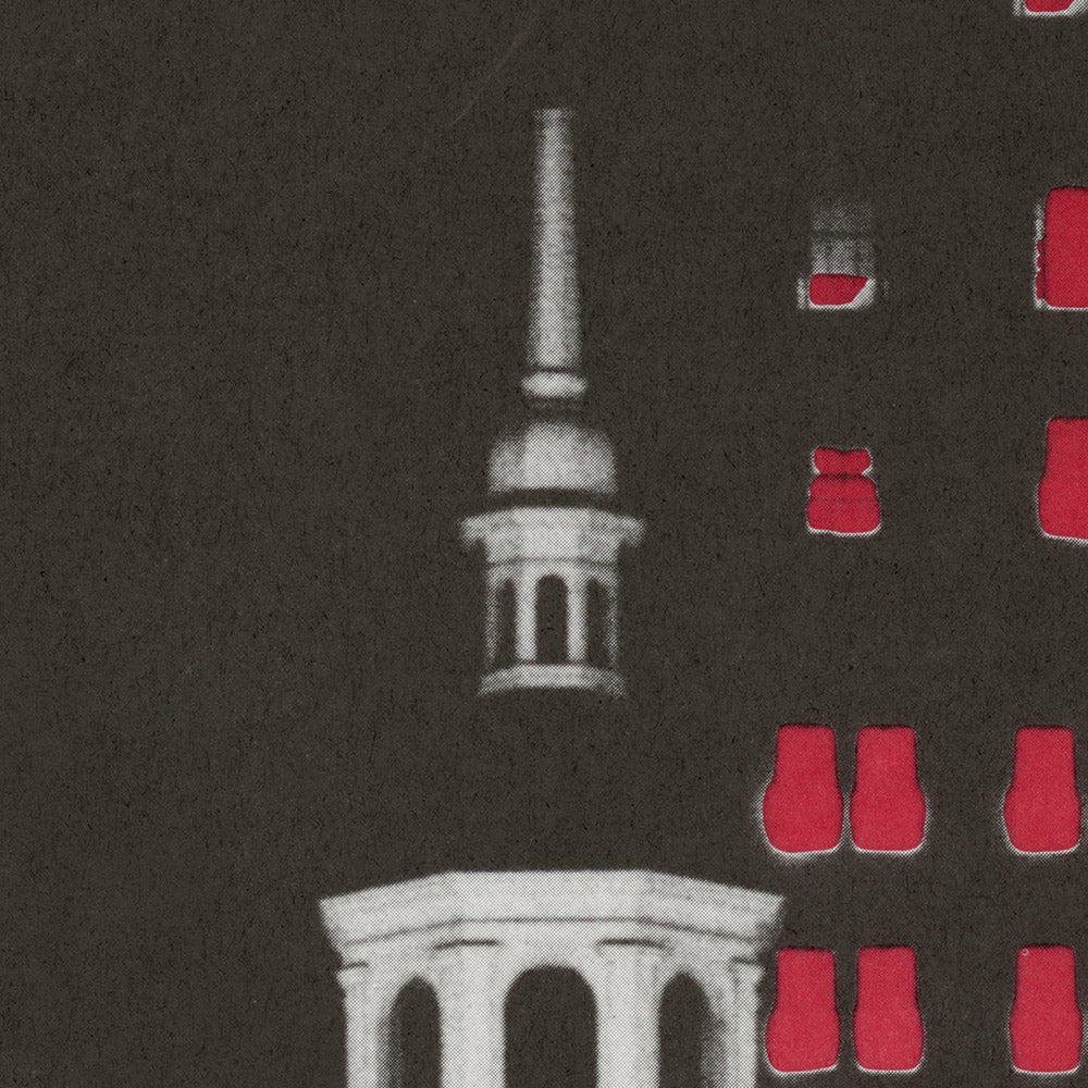 Design details to love: the print’s near‑monochrome scheme—stark blacks and luminous whites—creates a dramatic stage for precise architectural geometry. Halftone textures bring the masonry and surrounding foliage to life, while a vivid accent of red draws the eye to key features and typography, injecting energy without clutter. Negative space sharpens the silhouette of Independence Hall; a grid of windows and crisp orthogonal lines balance the organic sweep of trees. The result is a timeless composition that reads as both photograph and graphic icon—equally at home in modern, industrial, or Scandinavian interiors, and a compelling conversation piece for anyone drawn to American history and modern design.