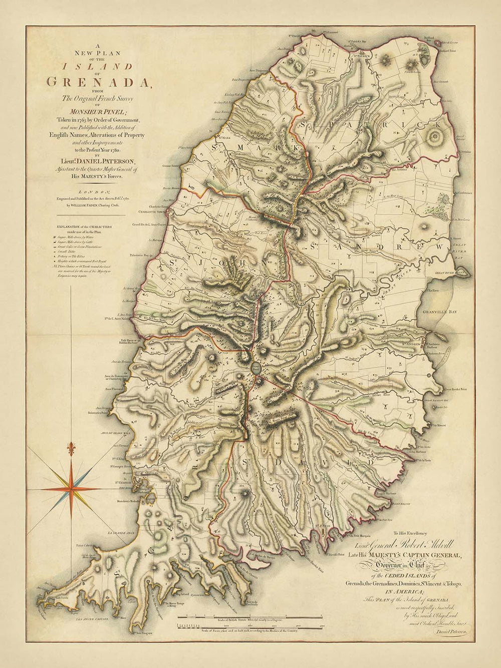Daniel Paterson, the esteemed British Army officer and mapmaker, was renowned for his rigorous attention to detail and his dedication to the art of military and administrative cartography. Paterson’s career, which included service as assistant to the Quartermaster-General and later as Lieutenant Governor of Quebec, endowed him with a unique perspective on the strategic and economic imperatives of the British Empire. His maps, prized for their accuracy and clarity, were essential tools for both governance and commerce, and this plan of Grenada stands as a testament to his skill and vision.