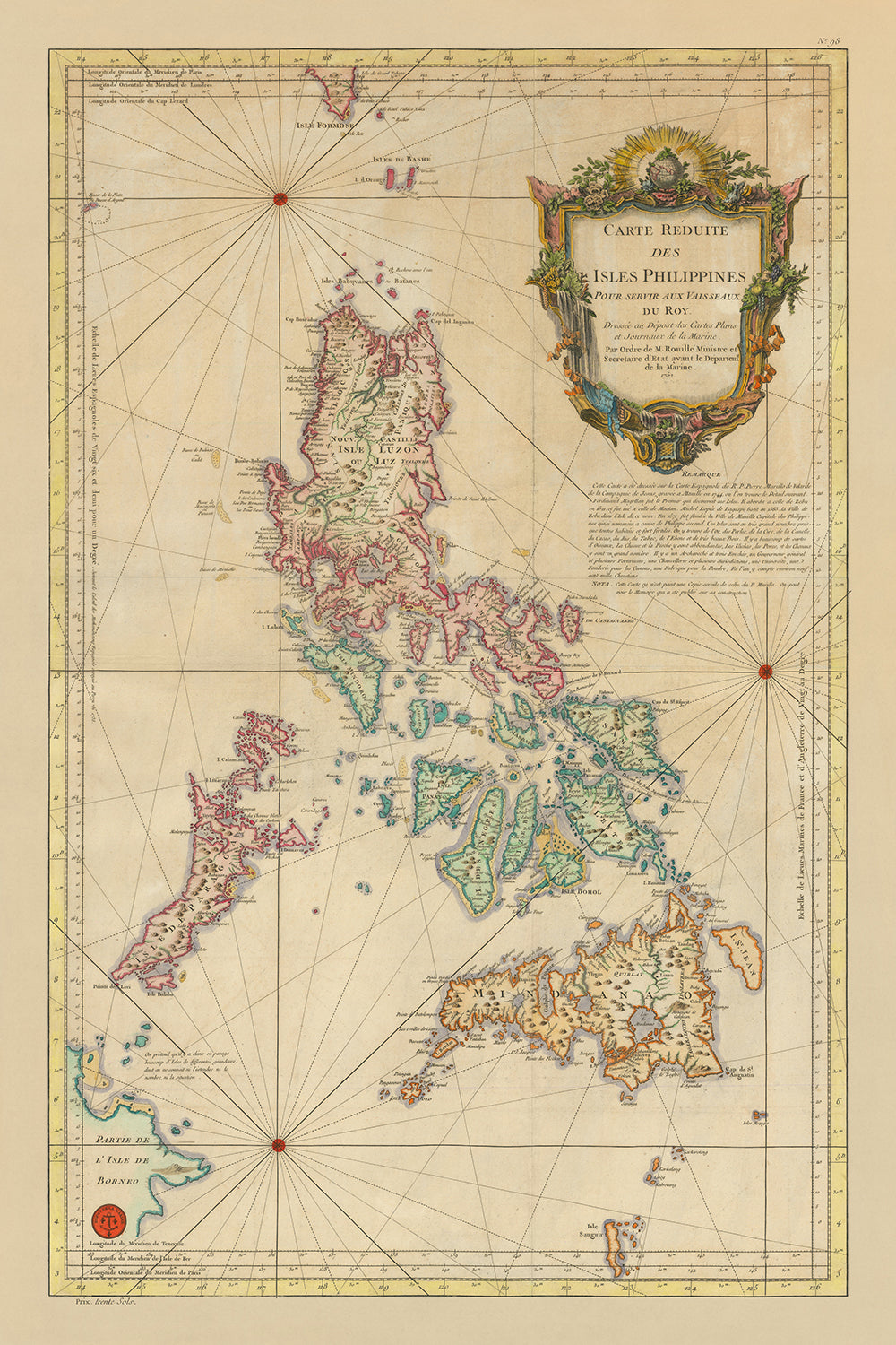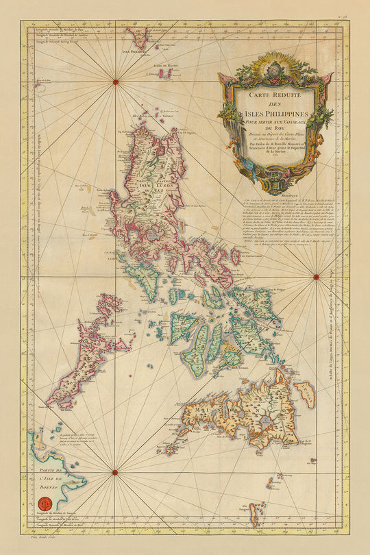 La "Carte Reduite des Isles Philippines Pour Servir Aux Vaisseaux du Roy Dressée au Dépost des Cartes Plans et Journaux de la Marine" es una creación magistral de Jacques-Nicolas Bellin, el estimado Hidrografo de la Real Armada Francesa. Elaborada en 1752, este mapa se erige como uno de los primeros mapas náuticos de gran formato del Archipiélago Filipino, detallando meticulosamente las islas con un nivel de precisión sin igual. La obra de Bellin no es meramente un logro cartográfico, sino un artefacto histórico que captura la intrincada geografía y los asentamientos de Filipinas durante un tiempo de significativa tensión política y exploración.