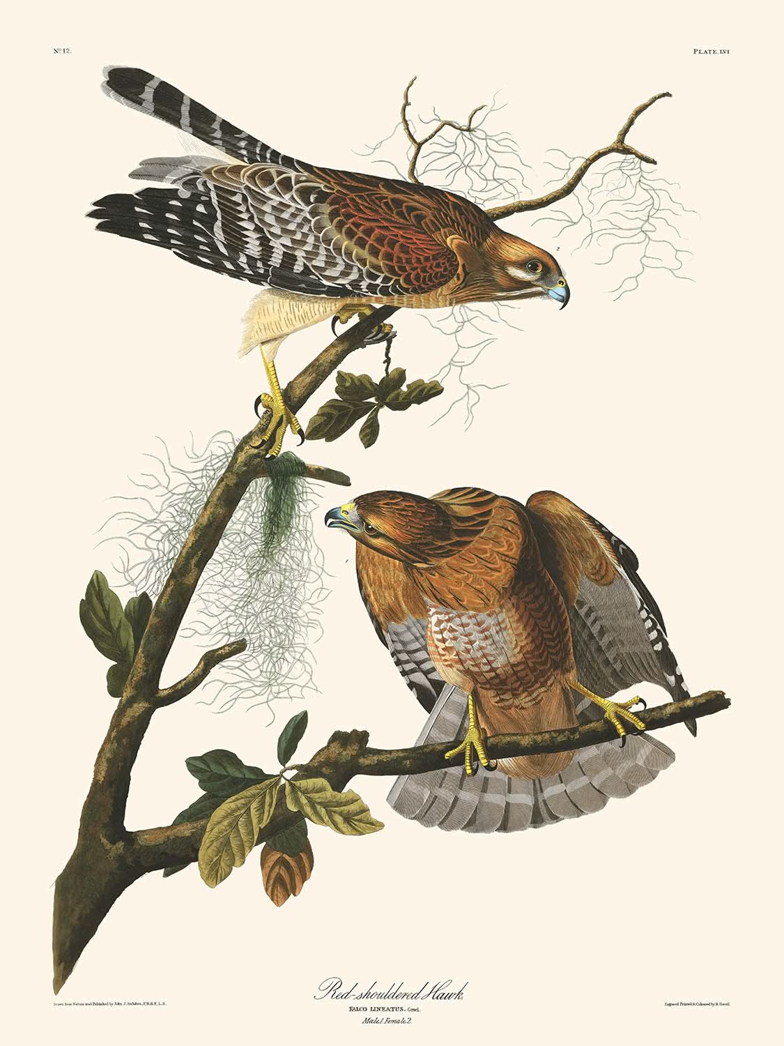 John James Audubon fue un pionero del arte de la vida salvaje estadounidense, célebre por su esfuerzo por documentar e ilustrar todo tipo de especies de aves de Norteamérica. Su obra en Birds of America, que consta de 435 grabados de tamaño natural, se ha convertido en una referencia crucial en la ornitología y la historia del arte debido a su amplitud y precisión. La ilustración del gavilán de hombros rojos representa tanto su habilidad artística como su devoción por la historia natural.
