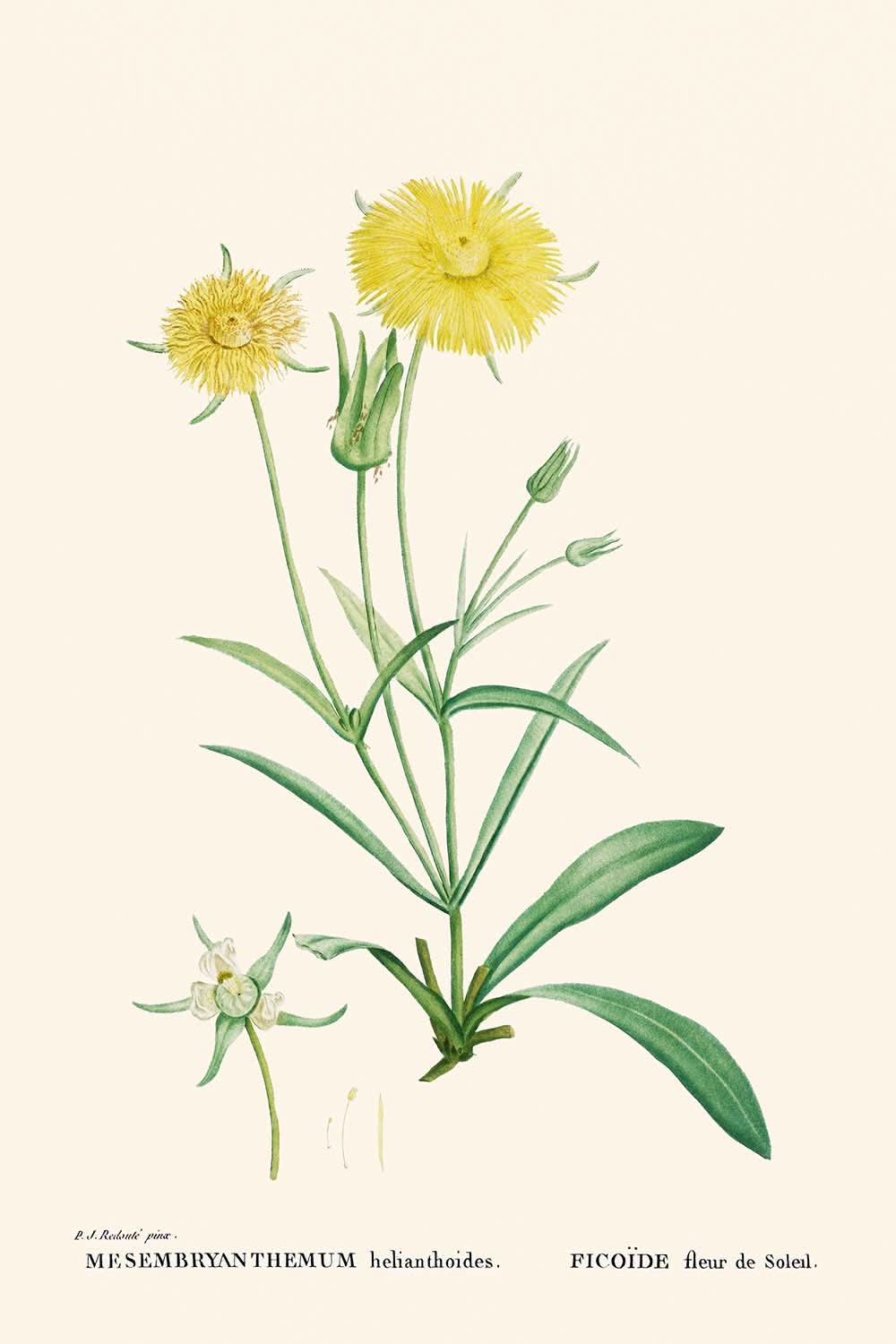 Admira la delicada belleza de la "Caléndula de hojas en espátula," una impresionante ilustración botánica del célebre artista Pierre-Joseph Redouté. Creada en 1802, esta obra captura los intrincados detalles del Mesembryanthemum helianthoides, una especie venerada por su floración única y vibrante. Redouté, a menudo aclamado como uno de los más grandes ilustradores botánicos de todos los tiempos, dedicó gran parte de su vida a documentar la flora del Château de Malmaison, bajo el encargo de Josefina Bonaparte, la esposa de Napoleón.
