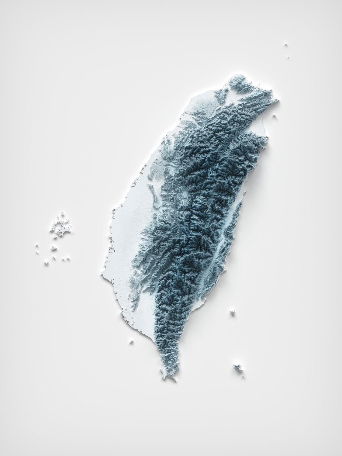 Este es un mapa topográfico en relieve minimalista de Taiwán, creado por The Unique Maps Co. y realzado con nuestro proceso patentado Unique 3D. No hay rótulos, ni carreteras, ni pueblos: solo los contornos y formas de la isla. El uso cuidadoso de la luz y la sombra da vida al paisaje: las crestas elevadas brillan al captar la luz, los profundos desfiladeros reposan en una sombra nítida, y las grandes llanuras bajas se registran como gradientes suaves y delicados.