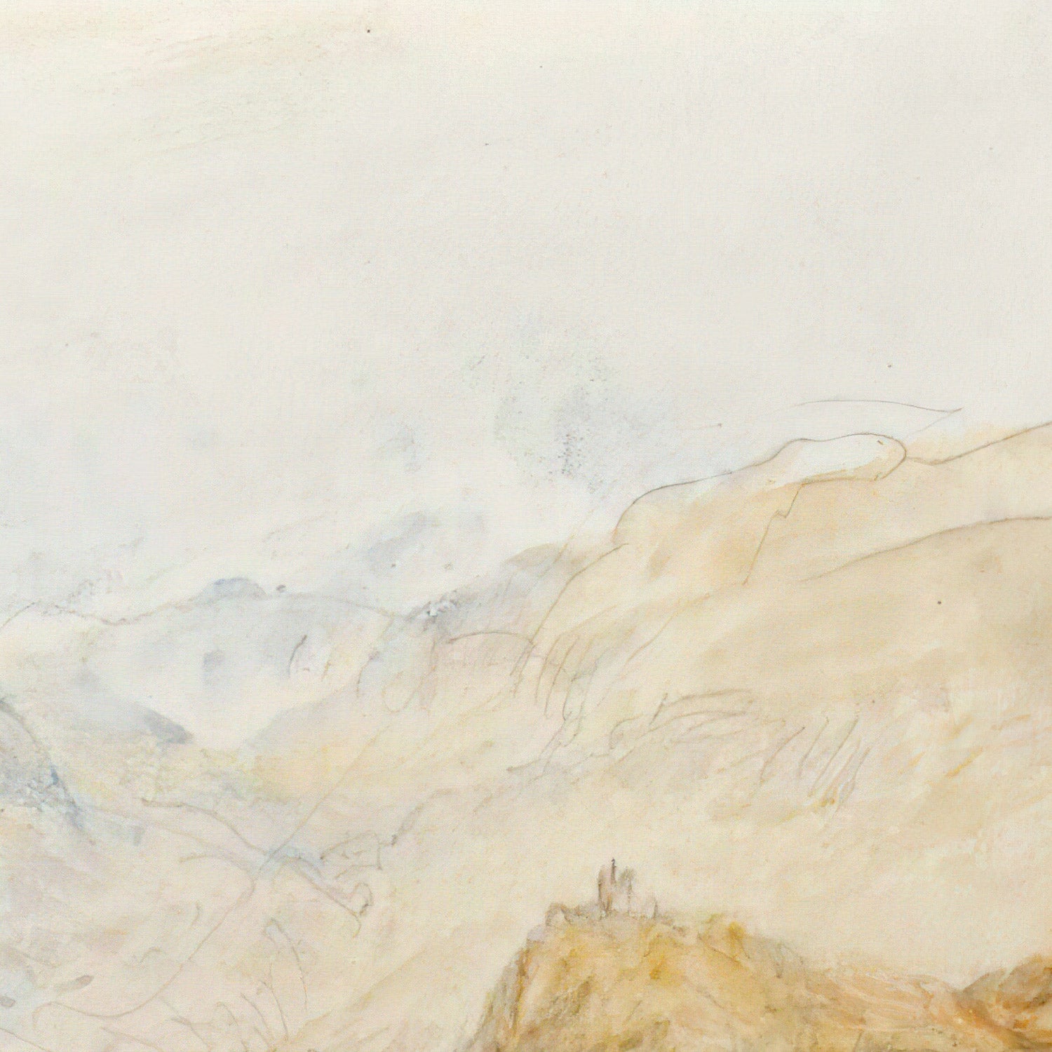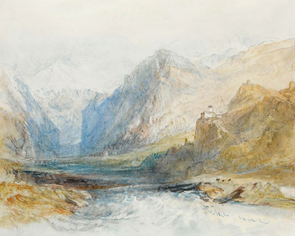 Turner (1775–1851), the great English Romantic, is celebrated for transforming landscape into light-filled poetry. By the 1840s he had honed a visionary approach to watercolor and wash, using transparency and layered tone to suspend landscapes between observation and dream. His travels in Alpine country deepened this language: he wasn’t merely recording topography, but translating the sensation of weather, distance, and shifting light.