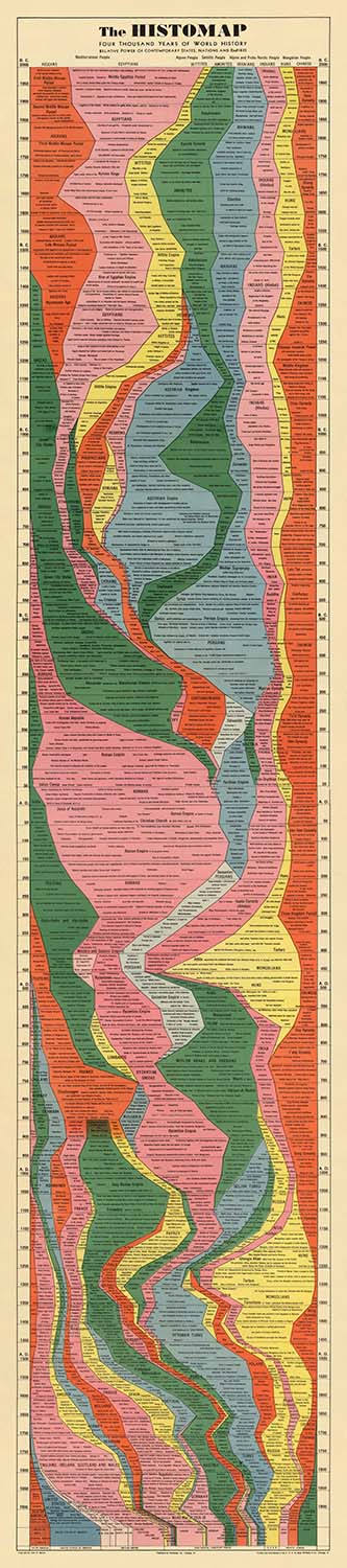 "The Histomap" is particularly notable for its groundbreaking approach to historical representation. Rather than traditional linear timelines, this lithograph employs a flowing, layered design that visually communicates the relative influence, power, and longevity of various civilizations and cultures over time. Its unique visual language invites viewers to explore history in an entirely new way, drawing connections and insights that traditional timelines simply cannot convey.