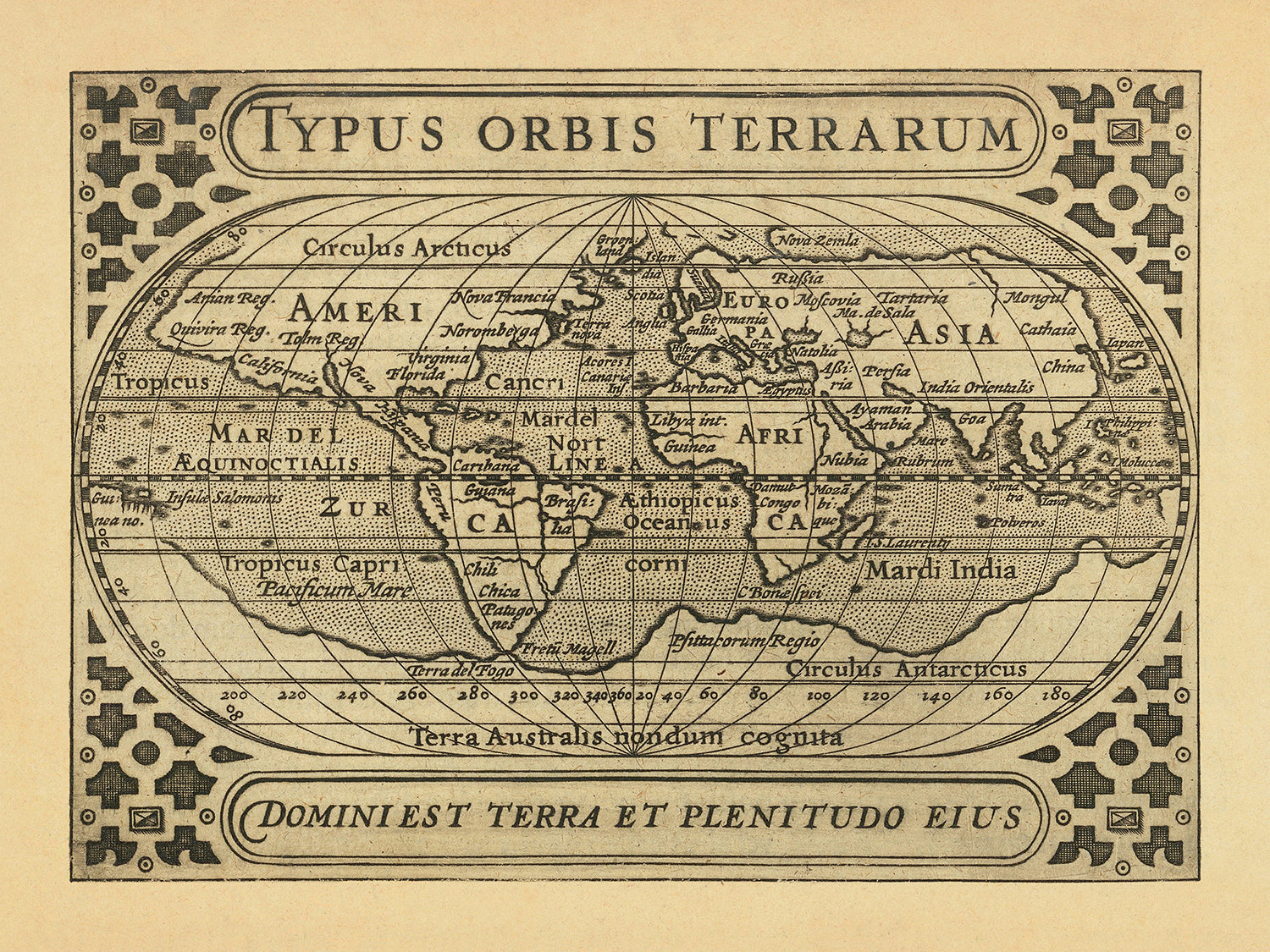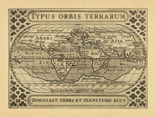 El "Typus Orbis Terrarum" también incluye fascinantes regiones especulativas, como Terra Australis nondum cognita, o la "Tierra del Sur aún no descubierta", que se extiende a lo largo de todo el lado sur del mapa. Esta área incluye Tierra del Fuego y Psittacorum Regio, una región supuestamente densamente poblada de loros, reflejando los límites del conocimiento contemporáneo y la naturaleza imaginativa de la cartografía temprana. El mapa también muestra América del Norte con topónimos familiares como California, Virginia y Florida, así como otros menos familiares como Anian y Quivira, insinuando el esquivo Paso del Noroeste.