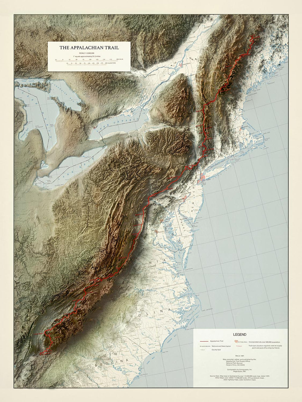 This map offers a sweeping view of the eastern United States, encompassing a vast array of natural wonders and historic regions. The trail itself is flanked by iconic national parks such as the Great Smoky Mountains and Shenandoah, as well as legendary forests like the White Mountain and Green Mountain National Forests. Majestic rivers, including the Hudson, Connecticut, and Susquehanna, snake across the terrain, while the shimmering blue of Lakes Erie, Ontario, and Huron anchor the map’s western edge. The relief style brings to life the undulating ridges of the Blue Ridge and Catskill Mountains, inviting the viewer to trace the journey from Springer Mountain to Mount Katahdin.