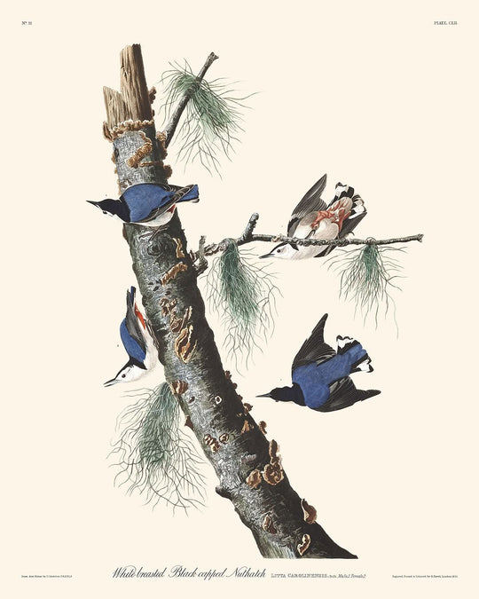 El "Trepador pechiblanco de cabeza negra" es particularmente notable debido a su encantadora representación de esta vivaz ave, conocida científicamente como Sitta carolinensis. La atención de Audubon a los detalles ecológicos y anatómicos ofrece una visión reveladora de sus comportamientos y hábitats. La interacción de grises serenos y azules sutiles proporciona un contraste exquisito con el pecho blanco como la nieve del ave, lo que hace de esta pieza una sofisticada incorporación a cualquier colección de arte.