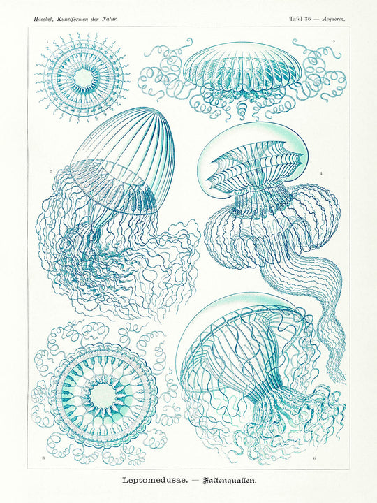 Leptomedusae Faltenquallen, publié pour la première fois en 1904, est une illustration de méduse époustouflante de l'éminent biologiste et artiste allemand Ernst Haeckel. Cette œuvre, un exemple exquis de son travail significatif "Kunstformen der Natur," capture la beauté complexe et la structure délicate de la vie marine.