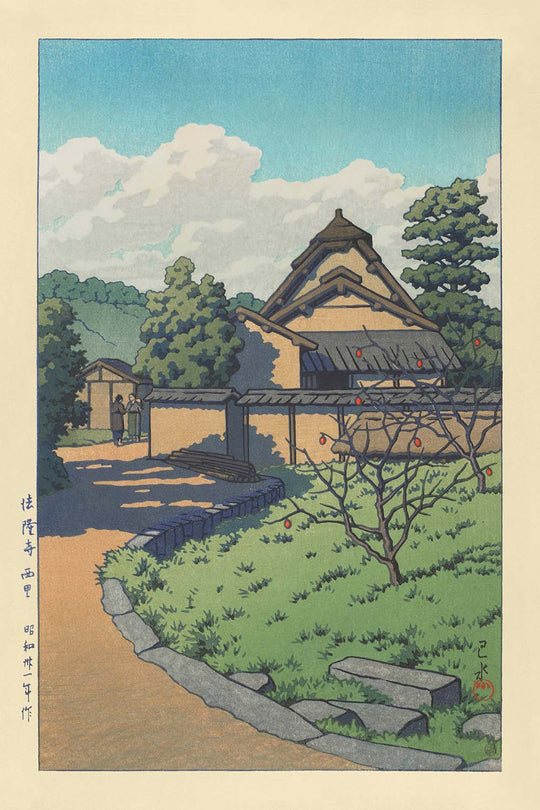 Temple Horyuji Village Ouest (Saiin Garan) par Hasui Kawase, 1935