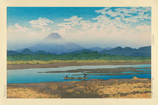 Hasui Kawase reste célébré pour ses paysages et ses vues urbaines atmosphériques, caractérisés par une attention méticuleuse aux détails et un jeu évocateur de lumière et d'ombre. "Mt. Fuji depuis la rivière Banyu" est particulièrement notable pour la façon dont il présente la montagne emblématique dans l'étreinte paisible d'un paysage harmonieux. L'interaction vibrante des teintes bleues dominantes avec des nuances de vert rafraîchissantes capte le regard du spectateur, chaque couleur étant appliquée avec soin pour représenter l'harmonie sereine que l'on trouve dans la nature—un signe distinctif du style de Kawase.