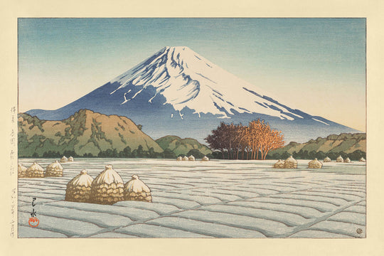 La notoriété de Hasui Kawase découle de sa représentation habile de paysages sereins et pittoresques capturant souvent la beauté tranquille des scènes rurales et urbaines japonaises. Son travail illustre le mélange harmonieux d'humeur, d'atmosphère et d'éléments culturels du Japon. La scène de Nagaoka, Izu, sous la lumière d'un matin gelé avec le Mont Fuji en toile de fond, dégage une ambiance paisible et contemplative, une caractéristique de l'artisanat de Kawase et du mouvement Shin-Hanga.
