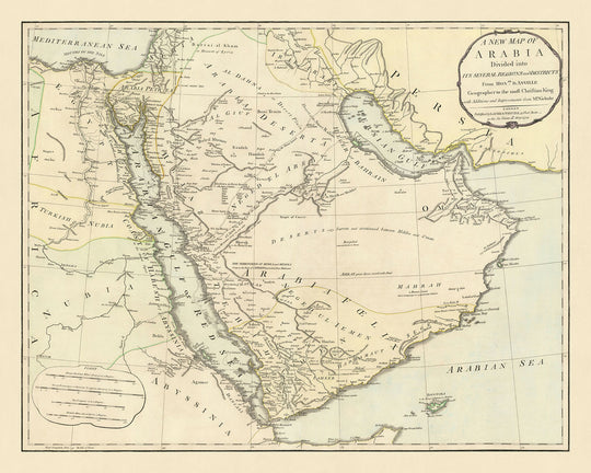 Enfin, le style de la carte mérite d'être mentionné. En tant que carte politique détaillée, elle va au-delà de la simple délimitation géographique pour offrir une vue globale de la dynamique politique du Moyen-Orient à la fin du XVIIIe siècle. Les créateurs de la carte, Laurie & Whittle, étaient connus pour leur attention méticuleuse aux détails et leur engagement envers l'exactitude, qualités qui se reflètent clairement dans cette carte. Cette carte est plus qu'un simple document cartographique ; c'est une fenêtre sur le passé, offrant un aperçu des contours historiques et politiques du Moyen-Orient au cours d'une période de changement et de développement importants.