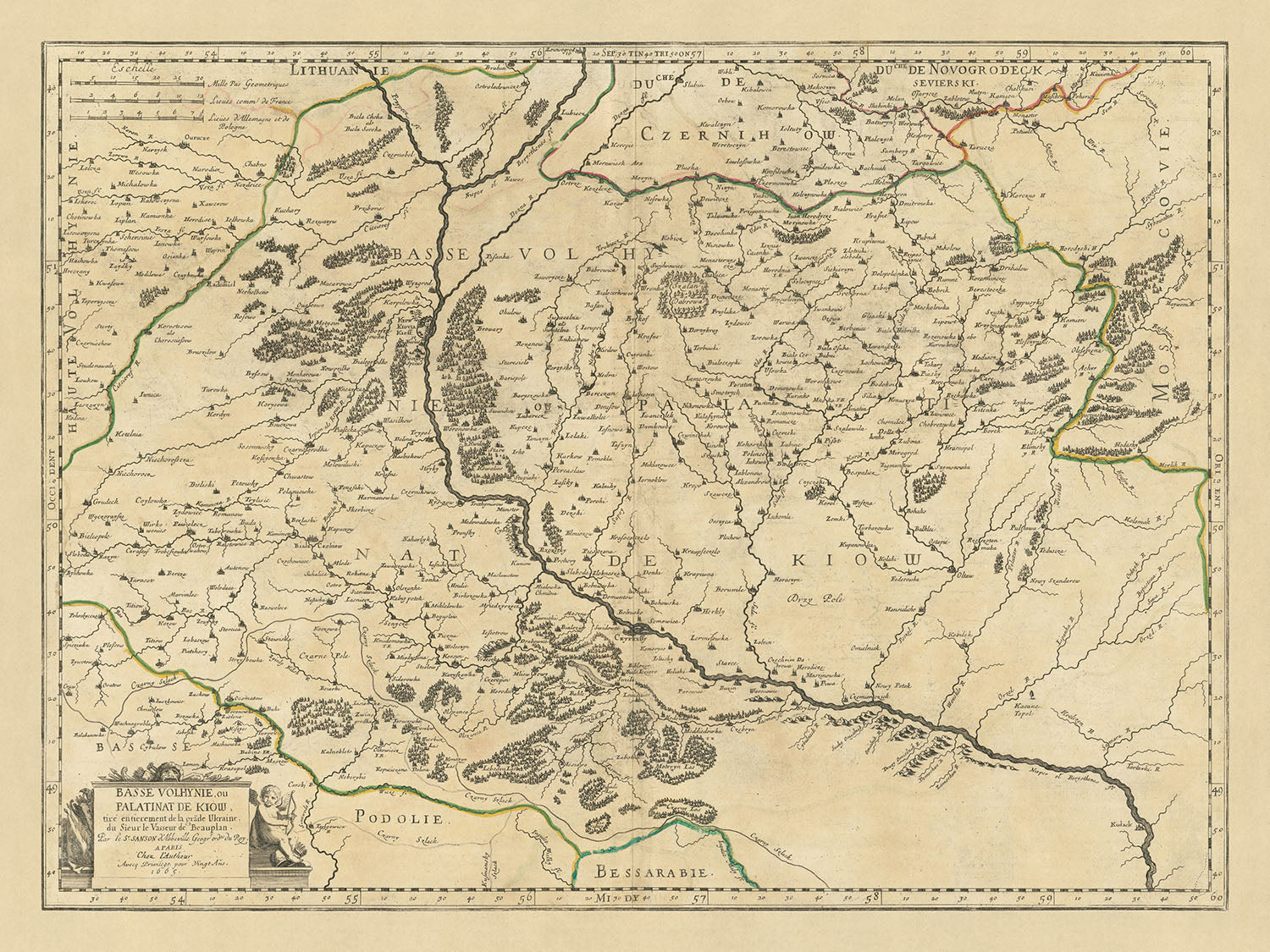 Ancienne carte de l'Ukraine par Sanson, 1665 : Kiev, fleuve Dniepr, Tchernihiv, Poltava, forêts