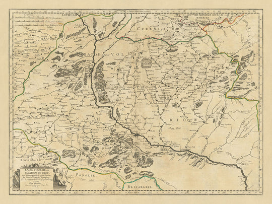 La représentation détaillée du paysage politique et physique sur la carte est tirée des cartes de Guillaume Levasseur de Beauplan, mettant en valeur l'esprit de collaboration de la communauté cartographique dans la poursuite de la connaissance et de l'exploration. Le travail de Sanson témoigne de la quête constante d'une compréhension du monde dans toute sa complexité, de la délimitation des frontières à la cartographie des phénomènes naturels. La carte sert de pont entre le passé et le présent, offrant un aperçu de la dynamique géopolitique de l'époque et de la beauté naturelle de la région, méticuleusement capturée grâce à l'art de la cartographie.