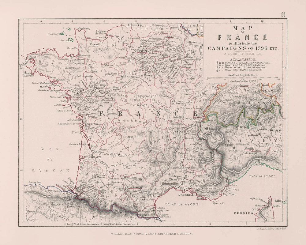 Le talent artistique de W. & AK Johnston, célèbres graveurs d'Édimbourg, est évident dans la conception complexe de cette carte. Leur travail fait partie d'une collection plus vaste de 108 cartes et plans qui relatent les principaux engagements militaires à travers l'Europe. Cette carte n'est pas seulement une représentation géographique, mais un récit des manœuvres stratégiques et des batailles cruciales qui ont façonné le cours de l'histoire. Elle comprend une section explicative, enrichissant la compréhension du spectateur des symboles militaires et des fortifications représentés.