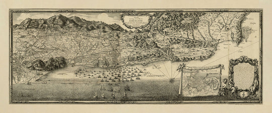 La conception de la carte reflète les riches traditions cartographiques de la fin du XVIIe siècle, mêlant talent artistique et précision militaire. Le relief pictural illustre de manière vivante la topographie de la région, mettant en valeur le terrain montagneux et les positions côtières stratégiques. La carte comprend notamment des représentations détaillées des lignes de siège, des fortifications et des forces navales dans la mer Méditerranée, offrant une vue complète de la complexité du conflit. L'attention portée par Beaulieu aux détails s'étend aux bordures artistiques et aux éléments décoratifs, qui renforcent l'attrait esthétique et la valeur historique de la carte.