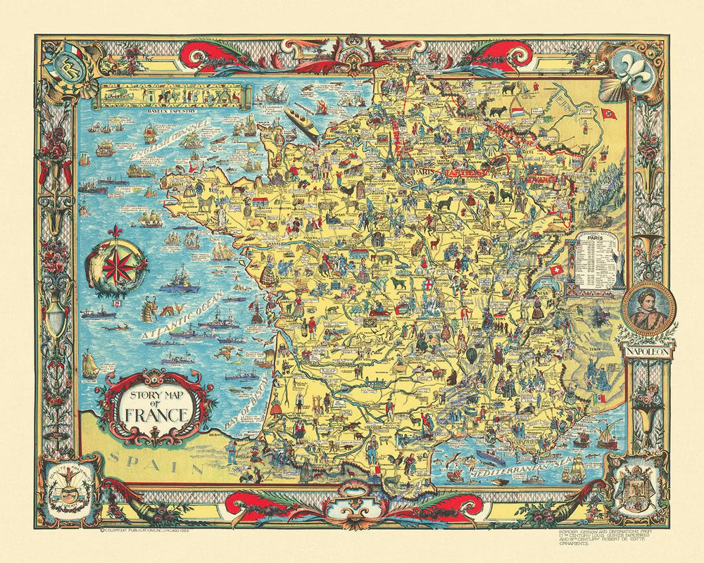 La « Story Map of France », réalisée par Colortext Publications Inc. en 1936, est un mélange captivant d'art et d'histoire. Cette carte picturale décorative invite les spectateurs à découvrir un tableau vivant de la France, mettant en valeur la riche mosaïque culturelle de la nation. Faisant partie d'une célèbre série de cartes narratives, elle offre une perspective unique sur le récit historique de la France, chaque illustration racontant sa propre histoire. Le cartographe, Colortext Publications, était célèbre pour ses cartes thématiques, qui combinaient précision géographique et flair artistique, faisant de cette pièce un véritable objet de collection.