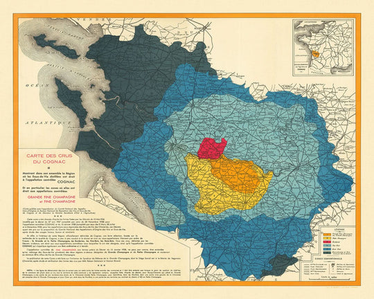 La conception et le style de la carte sont à la fois élégants et fonctionnels, reflétant la sophistication associée à la région de Cognac. L'utilisation de couleurs vives pour distinguer les différents crus est à la fois esthétique et informative, permettant aux visiteurs de comprendre facilement le système de classification complexe de la région. La carte présente également des représentations détaillées des routes et des voies ferrées, illustrant la connectivité et l'accessibilité de cette importante région viticole. De telles caractéristiques font de la carte non seulement un outil de compréhension de la géographie de Cognac, mais aussi une fenêtre sur l'infrastructure historique de la région.