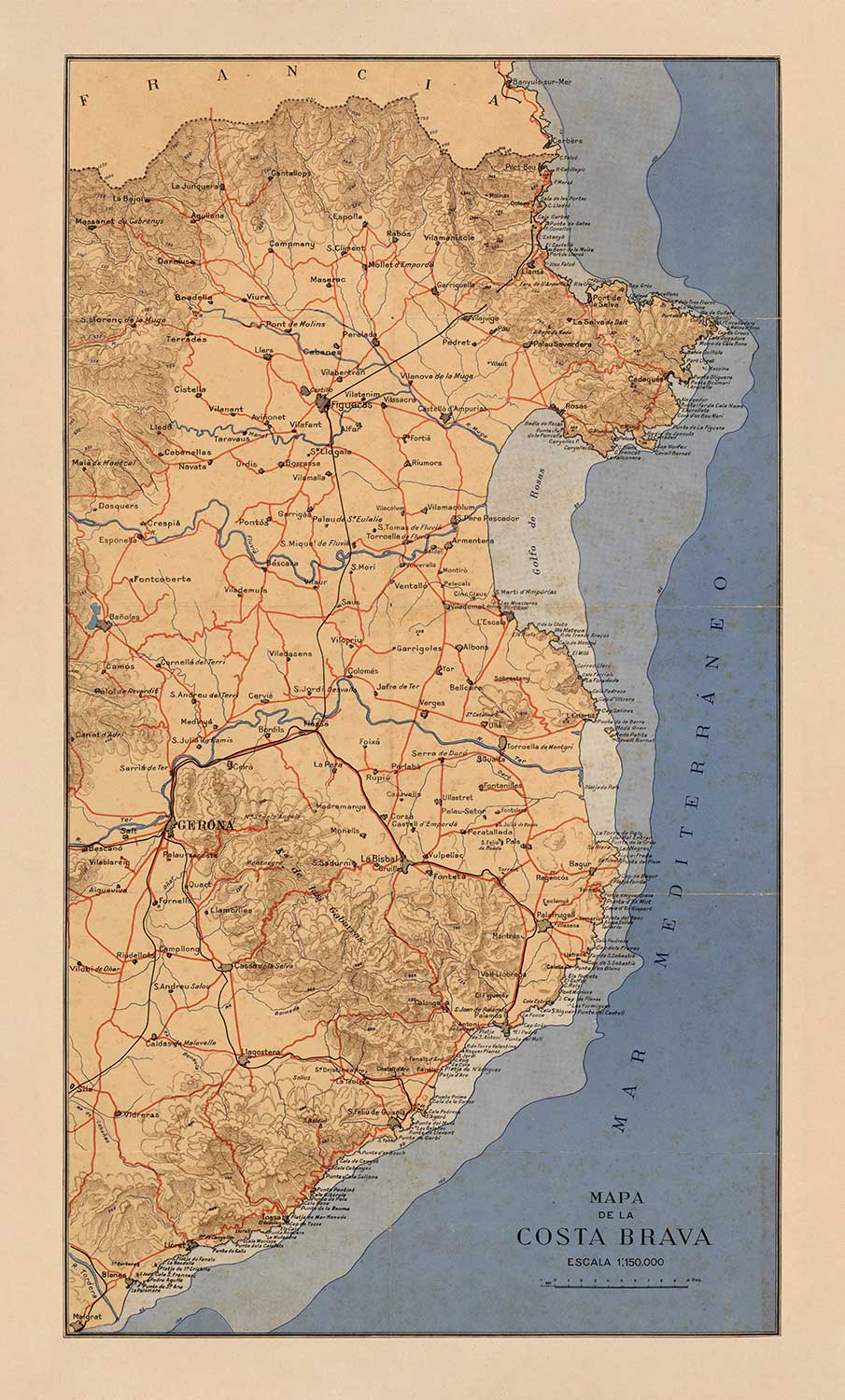 Ancienne carte de la Costa Brava par Dolcet en 1950: Gérone, Figueres, Tossa de Mar, Lloret de Mar, Blanes