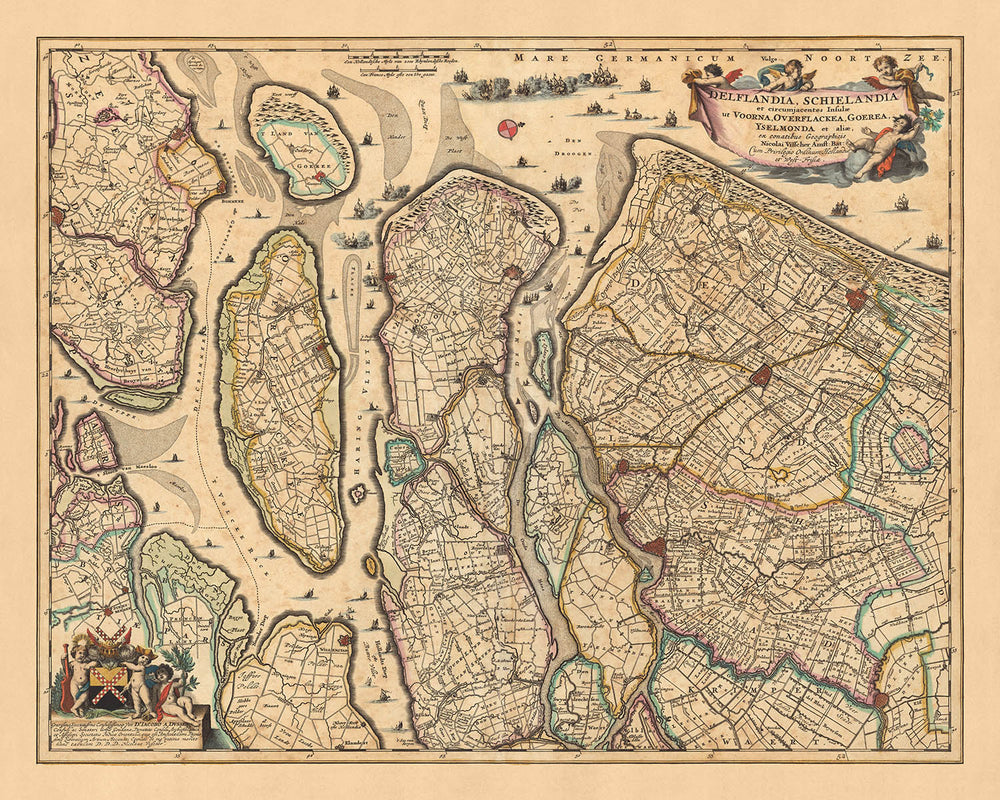 Ancienne carte de Delfland et Schieland par Visscher, 1690 : La Haye, Rotterdam, Delft, Hellevoetsluis, Ridderkerk