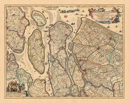 Ce morceau d'histoire remarquable est une ancienne carte de Delfland et de Schieland, méticuleusement élaborée par Nicolaes Visscher II en 1690. Faisant partie de l'âge d'or néerlandais, les cartes de Visscher étaient réputées pour leur précision et leur souci du détail, et cette carte ne fait pas exception. Le nom complet de la carte, « Delflandia, Schielandia et circumjacentes insulae ut Voorna, Overflakkee, Goerae, Yselmonda et aliae », se traduit par « Delfland, Schieland et les îles environnantes telles que Voorne, Overflakkee, Goeree, IJsselmonde et autres ». Cela fournit une indication claire des régions et des divisions politiques couvertes par la carte, qui correspondent principalement à la zone moderne des Pays-Bas.