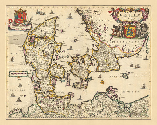Enfin, la carte illustre le parc national de la mer des Wadden, un site du patrimoine mondial de l'UNESCO connu pour son système unique de vasières. Cette inclusion témoigne du caractère exhaustif de la carte, capturant non seulement les établissements urbains mais également les sites naturels importants. Cette carte « Regni Daniae : Novissima et accuratissima tabula » est un témoignage des compétences cartographiques de Visscher et un artefact remarquable de géographie historique.