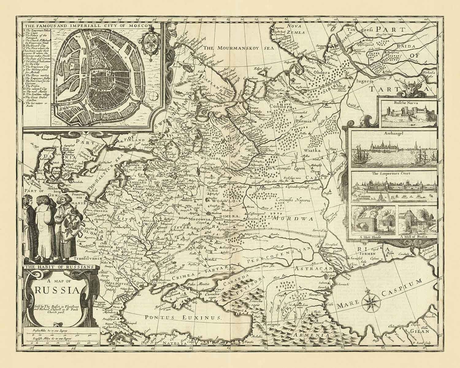 Old Map of Russia, 1676 par John Speed - Peter the Great's Russian Empire, Old Europe, Moscou, Kiev, Tatars, Ukraine