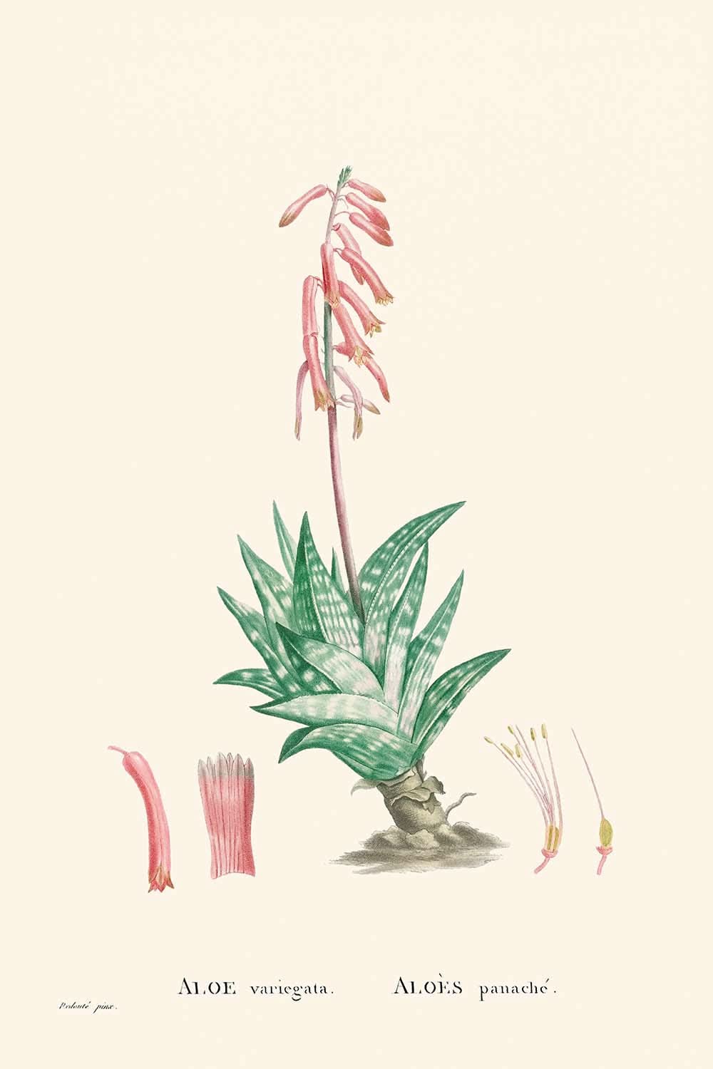 L'Aloe Variegata, communément appelé Aloe Tigré, est représenté avec une précision et une vivacité remarquables. Ce joyau botanique est célébré non seulement pour son attrait esthétique, mais aussi pour sa précision scientifique. L'art de Redouté se caractérise par l'utilisation complexe de la couleur et du style, capturant l'essence du sujet avec élégance et clarté.
