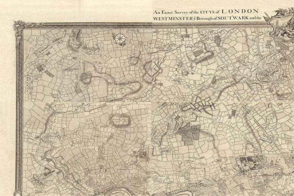 C'est la principale carte de Londres du 18ème siècle et ne serait pas dépassée depuis plus de 100 ans. Il n'y a pas non plus d'autres cartes de cette qualité de cette époque. C'est une chance très rare de voir les banlieues de Londres quand elles étaient toutes principalement des villes, des villages et des ... champs vides.