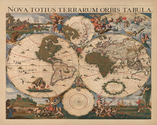 En essence, la "Nova Totius Terrarum Orbis Tabula" est plus qu'une simple carte ; c'est une fenêtre sur le passé, offrant des perspectives sur les aspirations et les imaginations de ceux qui ont cartographié l'inconnu. Son mélange de cartographie précise et d'éléments spéculatifs invite les spectateurs à explorer non seulement le monde physique mais aussi les possibilités illimitées qui se trouvent au-delà de l'horizon. Cette carte est une véritable pièce de collection, une célébration de l'esprit aventurier qui continue d'inspirer explorateurs et historiens.