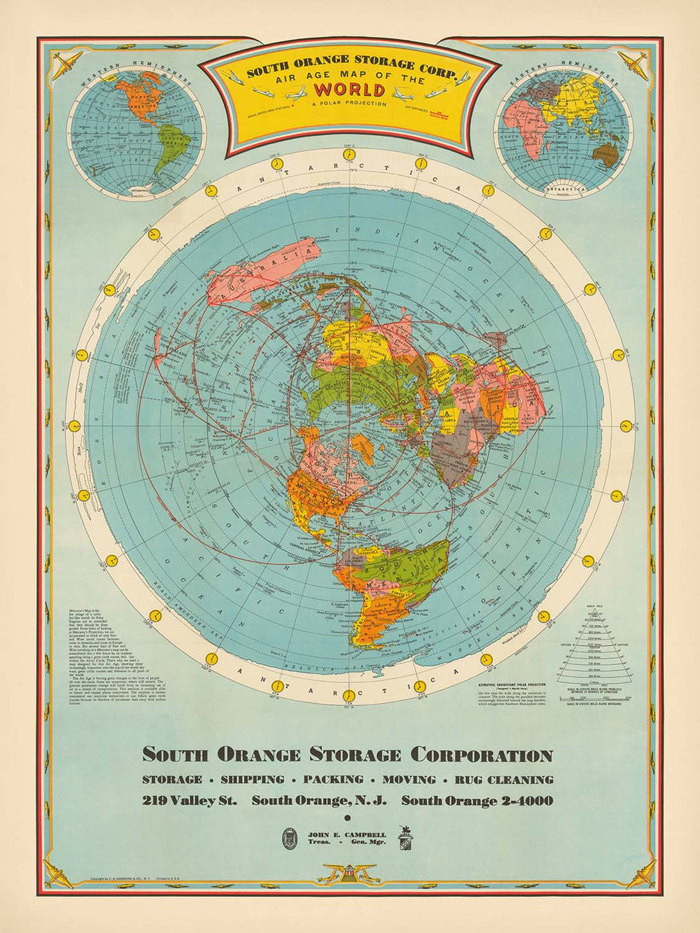 Ancienne carte du monde des grands cercles aériens par Hammond, 1938: Affiche de projection polaire "Ère aérienne"
