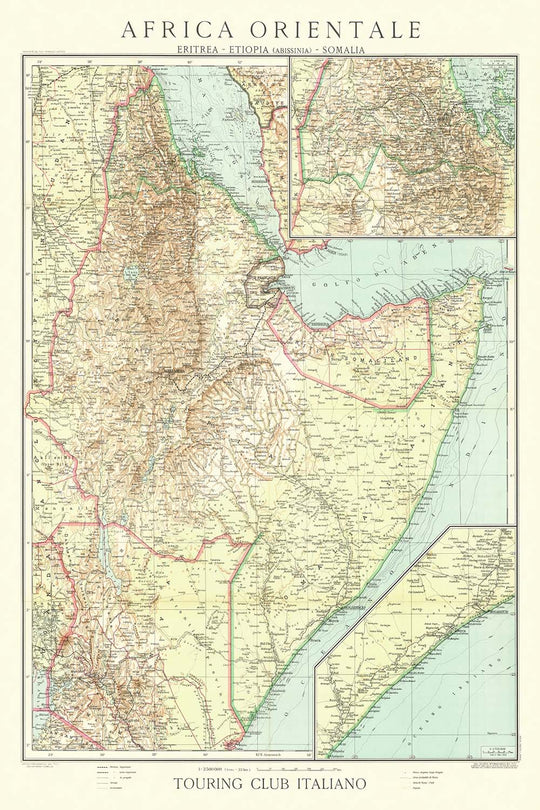 Ancienne carte de l'Afrique de l'Est par le Touring Club Italiano, 1936: Addis-Abeba, Mogadiscio, Mer Rouge, Chemins de fer, Cartes en encart