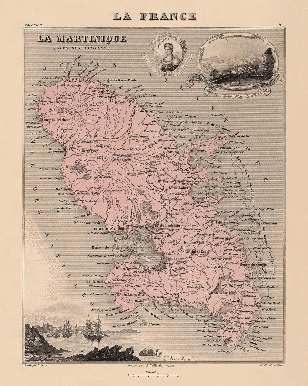 Le design de la carte est un chef-d'œuvre de clarté cartographique et d'élégance décorative. L'utilisation de la couleur par Vuillemin délimite les divisions administratives de l'île, tandis que les armoiries décoratives et les scènes maritimes soulignent l'importance stratégique de la Martinique en tant que poste colonial français. Le terrain montagneux, les régions côtières luxuriantes et l'hydrographie détaillée évoquent la beauté naturelle spectaculaire de l'île, de ses sommets volcaniques à ses vallées verdoyantes et ses rivages étincelants. La composition de la carte invite le spectateur à explorer non seulement la géographie, mais aussi l'expérience vécue des habitants de la Martinique.