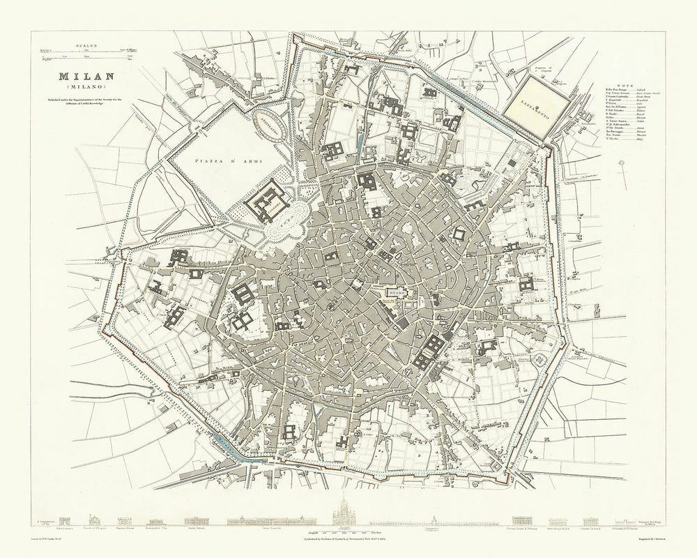 Le dévouement de la SDUK à l'excellence éducative est évident dans les illustrations détaillées de douze bâtiments publics significatifs le long du bord inférieur de la carte. Ces comparaisons à l'échelle offrent une perspective unique sur la grandeur architecturale de Milan, y compris des structures comme le Lazzaretto, un ancien centre de quarantaine désormais démoli. Une telle attention aux détails souligne la valeur de la carte à la fois en tant qu'outil éducatif et œuvre d'art.
