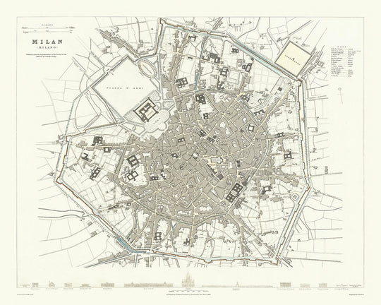 Reculez dans le temps avec la captivante carte de "Milan (Milano)", réalisée en 1832 par la célèbre Société pour la Diffusion du Savoir Utile (SDUK). Cette carte exquise offre un aperçu détaillé de la riche histoire de Milan, capturant la ville telle qu'elle était à l'intérieur de ses murs espagnols durant une période d'expansion rapide. Le design complexe de la carte met en valeur la disposition symétrique de Milan, avec le majestueux Château Sforza servant d'axe central. C'est une représentation fascinante d'une ville à l'aube de la transformation, en faisant une pièce inestimable pour les passionnés d'histoire et les collectionneurs.