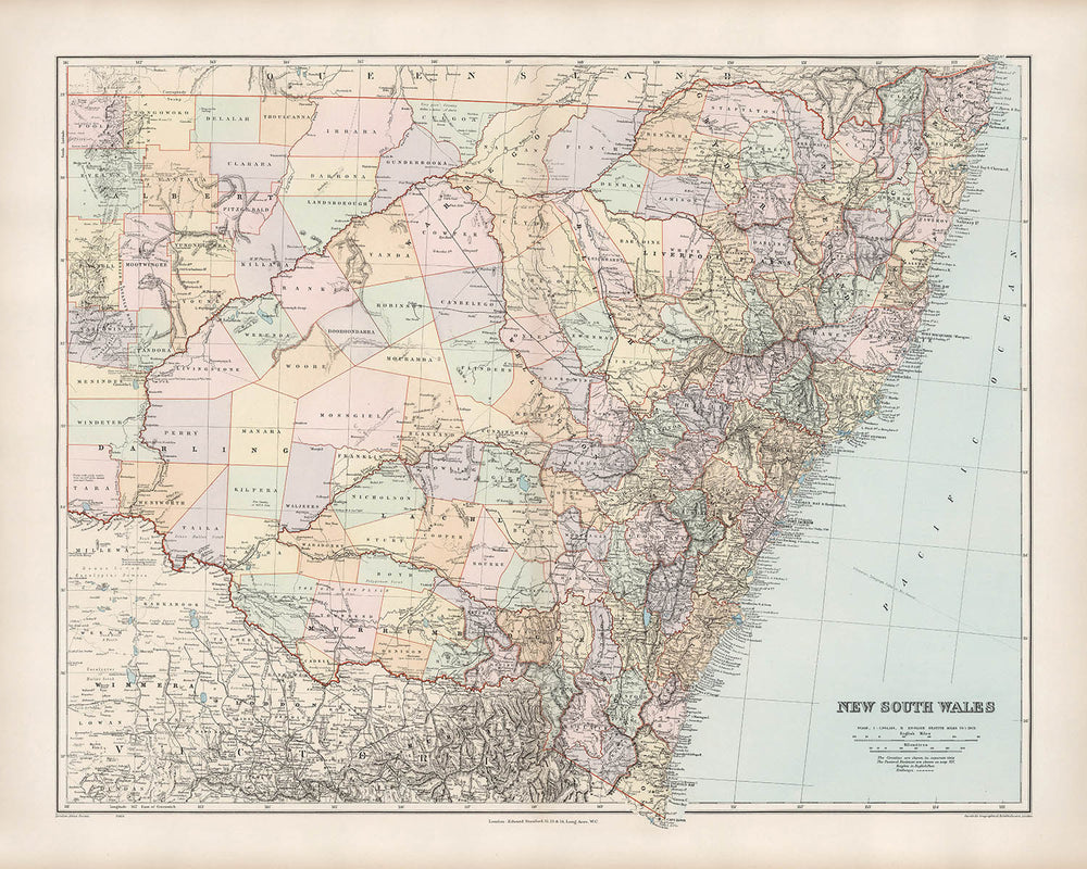 La carte intitulée "Nouvelle-Galles du Sud" par Edward Stanford, réalisée en 1904, est un témoignage de l'art de la cartographie à la veille du 20ème siècle. Stanford, une figure éminente dans le monde de la cartographie, a acquis les plaques de l'Atlas de Londres de John Arrowsmith, lui permettant de s'appuyer sur un héritage de documentation géographique détaillée. Cette carte fait partie d'un atlas publié pour la première fois en 1887, succédant au travail d'Arrowsmith de 1858. Le design complexe et la lithographie en couleur vibrante en font une pièce remarquable, reflétant à la fois les paysages politiques et physiques avec précision et art.