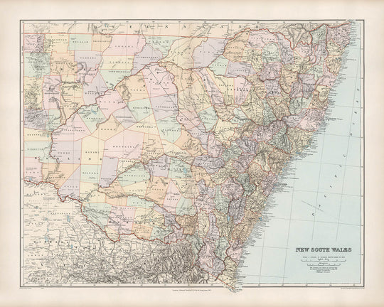 La carte met en avant les villes et villages animés de la Nouvelle-Galles du Sud, y compris Sydney, Newcastle et Wollongong, entre autres. Chaque établissement est soigneusement tracé, offrant un aperçu de la répartition de la population et du développement urbain du début des années 1900. Les caractéristiques côtières le long du bord est et la représentation des rivières et des plans d'eau ajoutent à l'attrait de la carte, offrant une vue complète de la beauté naturelle de la région.