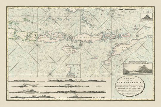 - Vues insets : Représentations des détroits de Larantooca et d'une île volcanique dans la mer de Banda.