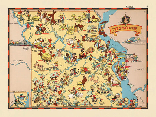 - Thèmes dépeints : La carte utilise des illustrations ludiques et exagérées pour représenter des scènes stéréotypées, des industries et des éléments culturels associés au Missouri dans les années 1930.
