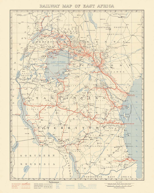 La carte illustre vivement la diversité géographique de l'Afrique de l'Est, avec des caractéristiques remarquables telles que le lac Victoria et l'imposant mont Kilimandjaro subtilement intégrés dans le design. Les frontières coloniales du Kenya, de la Tanganyika et de l'Ouganda sont clairement délimitées, offrant un aperçu du paysage politique de l'époque. Ces frontières, aux côtés des itinéraires de transport, brossent un tableau d'une région à l'aube de la transformation, prête à embrasser la modernisation tout en restant sous influence coloniale.