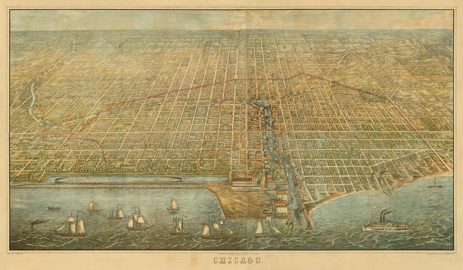 • Deuxième vue en perspective aérienne de Chicago au format large, après la vue de George Robertson de 1853