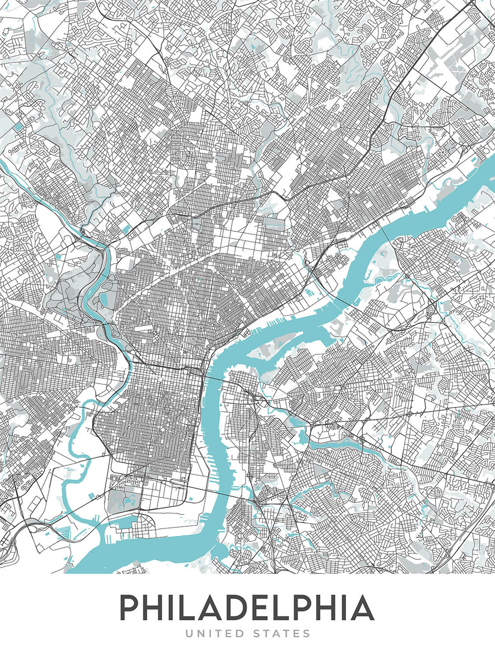 Cette carte est une invitation à explorer la riche histoire et la beauté captivante de Philadelphie et de sa région environnante. C'est un incontournable pour tous ceux qui apprécient le design moderne, l'art cartographique et le charme de cette ville remarquable.