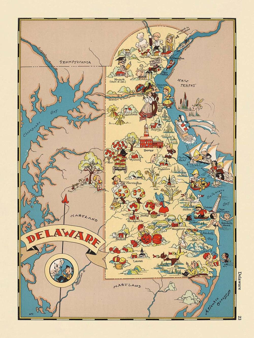 Carte picturale du Delaware par Ruth Taylor White, 1935: Wilmington, Dover, baie du Delaware, plages, premier État