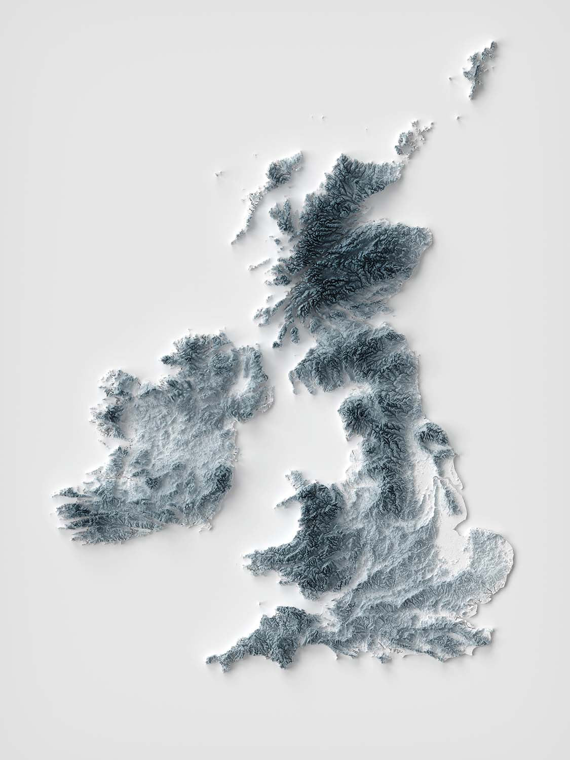 Admirez les vastes Highlands écossais, leurs sommets déchiquetés et leurs profondes vallées magnifiquement sculptées, avec des ombres nichées dans les vallées créant un sens dramatique de profondeur. La montée douce mais prononcée des Pennines forme une colonne vertébrale à travers le nord de l'Angleterre, tandis que les fells sauvages du Lake District se tiennent fièrement, leurs contours révélés dans un délicat relief. Le Pays de Galles est caractérisé par les hauts plateaux escarpés de Snowdonia et des Brecon Beacons, où un ombrage complexe définit chaque sommet et escarpement, soulignant la beauté sauvage du paysage gallois.