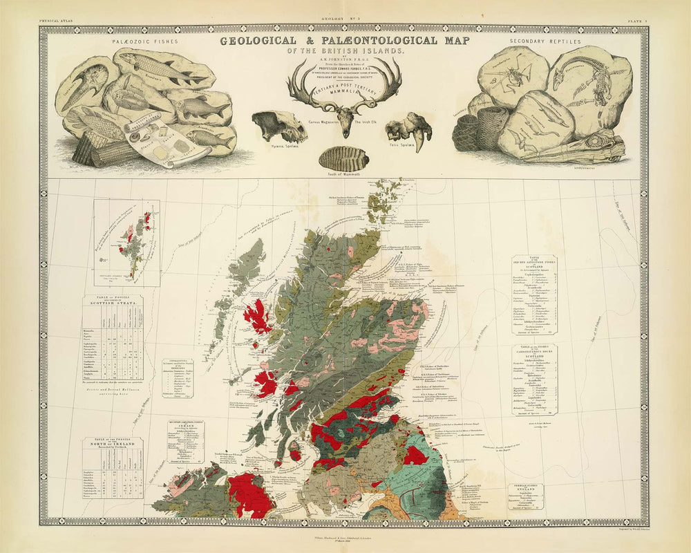Ceci est une carte plutôt inhabituelle des régions géologiques (roches) et paléontologiques (fossiles) de l'Écosse. Ce qui est encore plus inhabituel, c'est qu'elle a été créée il y a longtemps, en 1854, gravée par A.K. Johnston à partir des notes et enregistrements d'Edward Forbes.