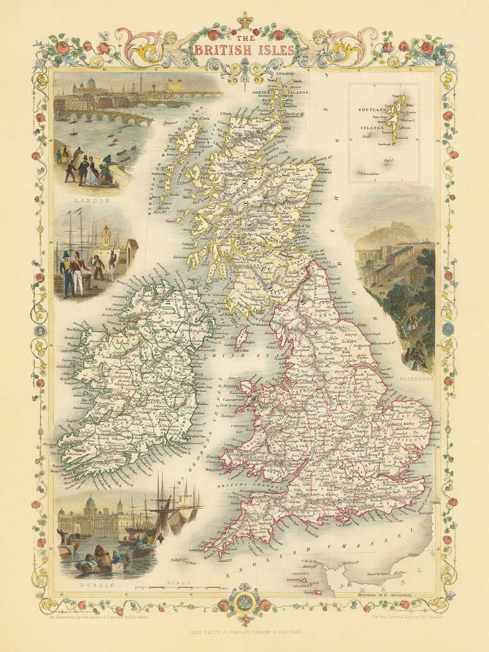 Ancienne carte des îles britanniques par Tallis, 1851: La dernière grande carte décorative