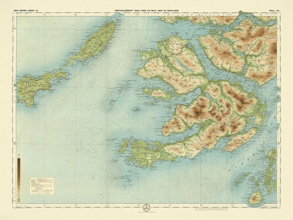 Feuille 10 - Mull, réalisée par le cartographe estimé JG Bartholomew en 1901, est un chef-d'œuvre de la cartographie du début du XXe siècle. Bartholomew, connu pour ses cartes innovantes et de haute qualité, a créé cette carte détaillée à l'échelle d'un demi-pouce au mile pour répondre à l'intérêt croissant pour le cyclisme et le tourisme. Le titre original de la carte reflète l'accent mis sur l'île de Mull et ses environs, capturant l'essence de cette région sauvage et pittoresque de l'Écosse. La clarté et la précision de la carte, combinées à l'utilisation de couleurs pour représenter le terrain, en font non seulement un outil pratique pour les voyageurs, mais aussi une œuvre d'art.