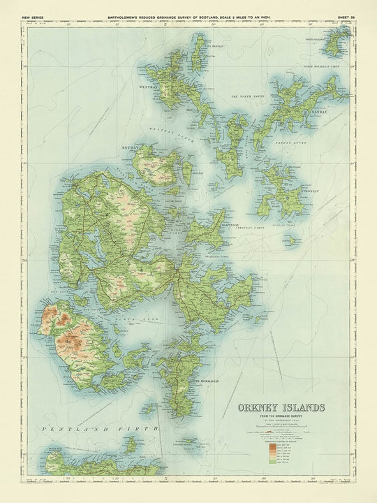 J.G. Bartholomew, un cartographe écossais de renom, a joué un rôle essentiel dans l'avancement de la cartographie thématique et l'utilisation de la couleur dans les cartes pour représenter les caractéristiques physiques. Son travail sur cette carte reflète son dévouement à rendre l'information géographique accessible et engageante. La carte des Îles Orcades est basée sur une carte d'Ordnance Survey réduite de la même période, mettant en avant la capacité de Bartholomew à distiller des données géographiques complexes en un format facile à lire et esthétiquement agréable. Ses cartes étaient connues pour leur précision et leur clarté, en faisant des outils indispensables pour les voyageurs et les érudits.